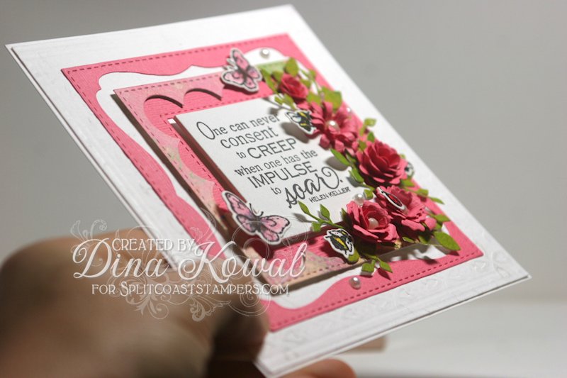 ReplyDeleteGorgeous rolled flowers and finished design Dina. I love all your cut bugs, colors and framing. All this with such an Inspiring quote! TFS mf.