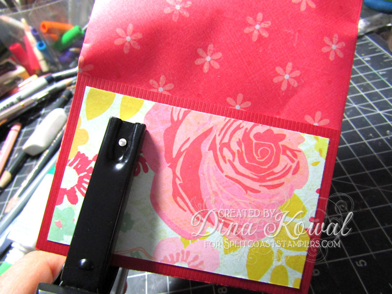 I created a topper from a quarter sheet of cardstock, and layered a piece of patterned paper (4" x 2-1/2") over it, then attached it to the sack with mini staples - you can see I have my stapler upside down - this puts the flat side of the staple on the back so nothing pokes out.