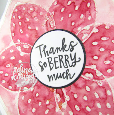 I am slightly obsessed with the idea of rotating panels in the MISTI to create symmetrical designs - I used the strawberry and seeds from the Berry Sweet set this way, positioning the berry just once, and turning the panel for each impression with a flat side along the bottom.