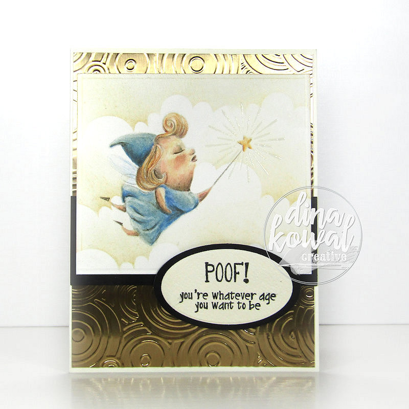 This has to be my favorite of the cards I made from the kit - I stamped the fairy in a light ink and colored her in with colored pencils. The sparkles around her wand are clear embossed, and I used the gold Delicata ink from the kit to stencil in the cloudy background. I love that gold paper - I embossed it with a Darice folder for some extra texture.